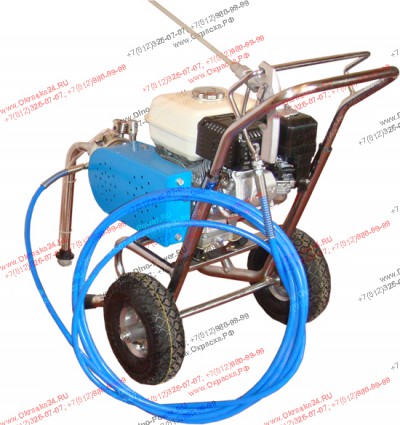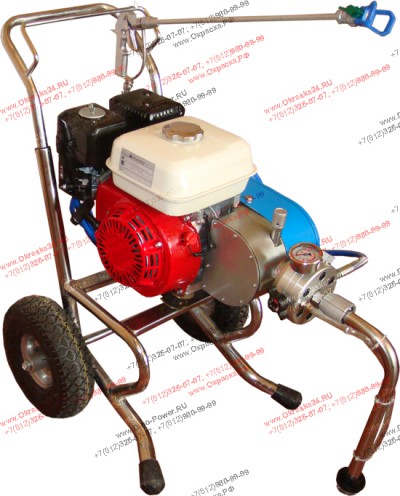 Окрасочная установка безвоздушного распыления - окрасочное оборудование с бензиновым двигателем. На данную модель окрасочного оборудования установлен двигатель HONDA 4 л.с. Работает на 92 бензине.
